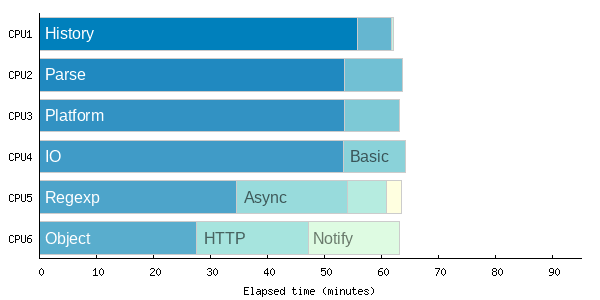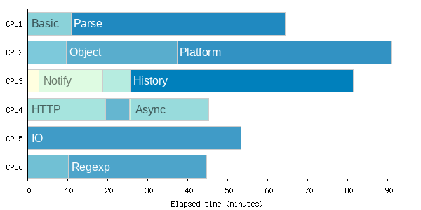 Finally, note that if there are dependencies between the tasks then schedule optimization is considerably more difficult as it requires a deep understanding of those dependencies to do correctly. I won’t get into that more complex scenario here; fortunately, in the ZipGit CI process and many other real-world examples, you really do have a collection of independent tasks, so the simple longest-first algorithm works well.