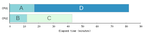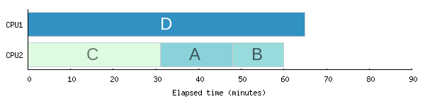 The total elapsed time is 82 minutes — literally the sum of the durations of tasks A and D. But you can easily see that if we rearrange things a bit, we can reduce that elapsed time. When the tasks are truly independent, we need only start them in longest-first order. In this example that means starting tasks D and C first, rather than A and B. When task C finishes at 31 minutes, it is replaced by task A, the next longest task. When task A finishes 17 minutes later, it is replaced by task B. This gives us a significant improvement in the total elapsed time: