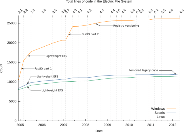 Note that here I’m measuring only actual code lines, exclusive of comments and whitespace, as of the upcoming 6.1 release. In total, the Windows version of the EFS has about 2x the lines of code that either the Solaris or Linux ports have. The platform-specific portion of the code is more than 6x greater!