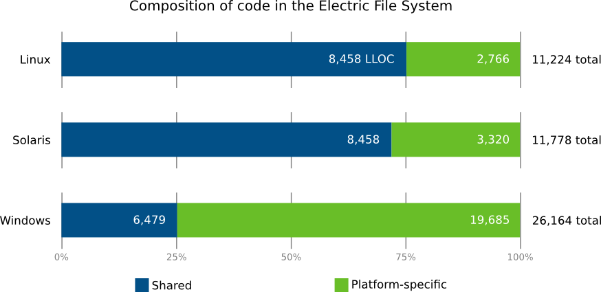 Somebody asked me the other day what portion of the Electric File System (EFS) is shared code versus platform-specific code. The EFS, if you don’t know, is a custom filesystem driver and part of ElectricAccelerator. It enables us to virtualize the filesystem, so that each build job sees the correct view of the filesystem according to its logical position in the build, even if jobs are run out of order. It also provides the file usage information that powers our conflict detection algorithm. As a filesystem driver, the EFS is obviously tightly coupled to the platforms it’s used on, and the effort of porting it is one reason we don’t support more platforms than we do now — not that a dozen variants of Windows, 16 flavors of Linux and several versions of Solaris is anything to be ashamed of!