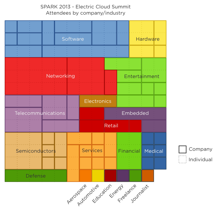 67 companies sent people to SPARK 2013, representing a broad array of industries. Some of those are the usual suspects, like software and telecommunications, but there are some surprises as well, like the 4 companies in the retail industry and the one in education. As they say, software is eating the world. Many companies sent only one representative, but just a bit more than half sent two or more. One large networking company sent fifteen people to SPARK 2013!