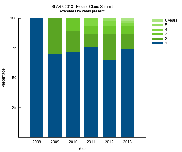 A solid 25% of the attendees in 2013 had attended at least one previous summit, slightly down from the percentage of repeat attendees in 2012, but in line with the historical average. Amazingly, three die-hard users have attended all six conferences!