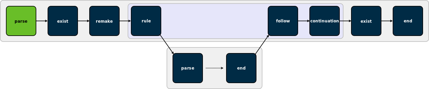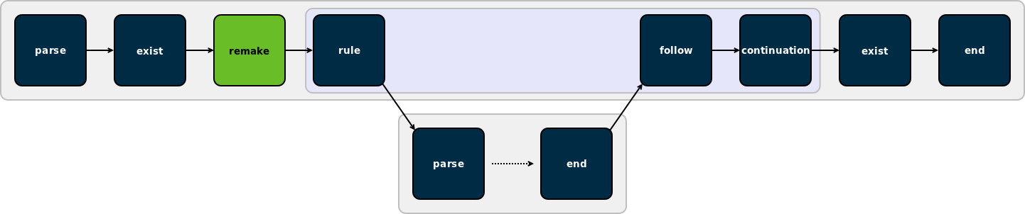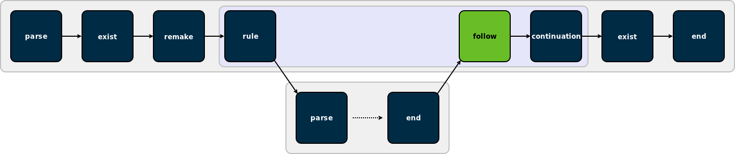 The table paints a grim picture for GNU make: there is no way to implement rules with multiple outputs using standard GNU make which reliably gives both correct results and good performance across all types of builds. The naive approach generates the output files correctly in serial builds, but may fail in parallel builds. The various hacks work for full builds, but may fail in incremental builds. Even in cases where the output files are generated correctly, the build is marred by spurious “is up to date” or “nothing to be done for” messages — which is why most of the entries in the GNU make side are yellow rather than green.
