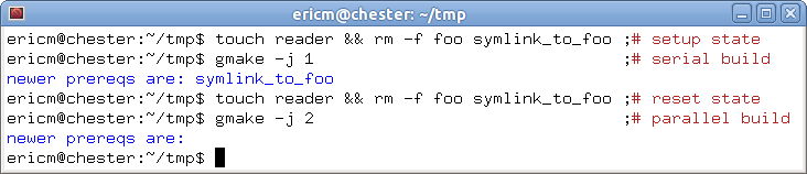 By the time GNU make goes to update bar, it’s already up-to-date thanks to the execution of the rule for foo. But look what happens when you run this same build in parallel: